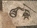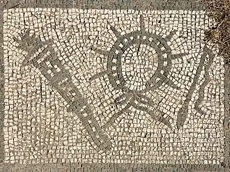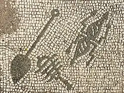 There were seven grades of initiation into Mithraism, which are listed by St. Jerome.[58] Manfred Clauss states that the number of grades, seven, must be connected to the planets. A mosaic in the Mithraeum of Felicissimus, Ostia Antica depicts these grades, with symbolic emblems that are connected either to the grades or are symbols of the planets. The grades also have an inscription beside them commending each grade into the protection of the different planetary gods.[4]: 132–133 In ascending order of importance, the initiatory grades were:[4](p 133–138)