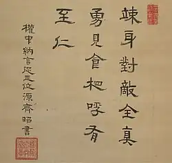 Nariaki was the 3rd son of Tokugawa Harutoshi, the seventh-generation daimyō of Mito. The family headship first passed to Harutoshi's eldest son Narinobu, before being passed on to Nariaki in 1829.[1] Nariaki was also leader of the Jōi (expel the barbarian) party and made a Bakufu adviser on national defence.[2] His childhood name was Torasaburo (虎三郎) later changed to Keisaburo (敬三郎).