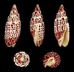 | Five views of a shell of Mitra papalis | |