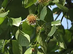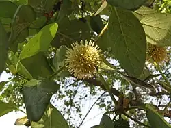 Mitragyna parvifolia is a tree species found in Asia,[2][3] native to India and Sri Lanka. Mitragyna species are used medicinally and for their fine timber throughout the areas where they grow. M. parvifolia reaches heights of 50 feet with a branch spread over 15 feet. The stem is erect and branching. Flowers are yellow and grow in ball-shaped clusters. Leaves are a dark green in color, smooth, rounded in shape, and opposite in growth pattern.[4]