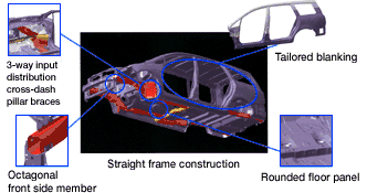 The 2003 Mitsubishi Grandis utilizes "straight frame construction", "octangular front side members", and "3-way input distribution cross-dash pillar braces" to minimize cabin deformation while absorbing and distributing impact energy. In addition, Grandis incorporates "tailored blank" technology whereby welds are formed between steel materials of varying thickness for improvements in both impact safety performance and weight reduction due to the optimal allocation of material.[1]