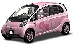From July 25 to 31, 2006 the company displayed a unique Mitsubishi i Hello Kitty edition at the Mitsukoshi department store in Tokyo's Nihonbashi district. Based on the two-wheel drive G model, it had a pink paint scheme with co-ordinated interior, "Princess Kitty" decals on the doors and windows, a ribbon decal on the roof, and themed headrests with small, feline ears. The car, which was described as "the most quintessentially Japanese car...ever" for fusing two of the country's cultural icons—Hello Kitty and keijidōsha[29]—was eventually sold in a charity auction on behalf of UNICEF.[29]