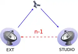 Example of a mix-minus (notated as n-1) from a studio to a satellite linked remote unit.