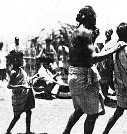 Earrings known as bengbeh were produced in several ways. The wealthiest individuals would wear ivory earrings termed saiha bengbeh inside their ears. It would stretch the earlobes out and make them hang outside of being worn. Poorer individuals would use a wooden earring in their lobe instead.[21] Thibeh was an earring that hanged off the earlobe as a single bead. Thibeh was a status symbol in which those who did not possess one was looked down upon. However, subjects under a Sailo chief were forbidden to wear it even if they could afford it. Thing bengbeh are wooden studded earrings. Men would pierce their ear with a small wooden stud of a flat head and half an inch in diameter. These were handed down generationally or used in dowry.[22]