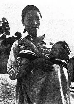 Ngotekherh or puanhruih is woven with a white and black background with a contrasting stripe of black or white.[12] Ngotekherh was woven using only black and white threads. It consisted of simple patterns of black and white strips.[13] Two deep black borders were assigned to the long edges of the cloth. After this, black stripes were added to the edges depending on individual preference, which would be around 2-6. Sometimes the black edges are woven with patterns of white wool under the black warp. The quality of Ngotekherh is assessed on the absence of white streaks in the black bars and stripes. Black strips are also hidden among the white cloth areas to give a checkered appearance in certain light conditions.[17] The name Ngotekherh gained its named from the term 'hruih' describing the transverse stripes. While this puan was historically worn by both genders, it is now only worn by women. The ngotekherh was popularised via wealthy individuals in Mizo society.[13] The Ngoterkherh is a traditional puan that was highly prized. The alternative puanhruih, has the component hruih referring to the stripes of the cloth. However puanhruih is an obsolete name as Ngoterkherh has taken over in the vernacular. Ngote refers to a pet name for a young boy or girl, while kherh refers to the same meaning as hruih. Ngotekherh was also used as a shawl by men who wore shirts later on. The Ngotekherh was most popular around the time of the Lushai Expedition until British annexation in the Chin-Lushai Expedition. After British annexation, men adopted Western wear while women maintained the use of ngotekherh.[18]