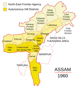 ![]() Map of Autonomous Hill Districts of Assam demanded by the All Party Hill Leaders Conference for a separate Hill State. | |||||||||