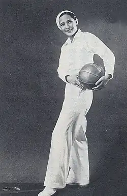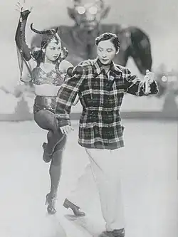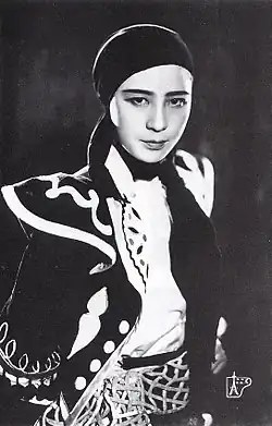 Born Umeko Miura in Otaru, Hokkaido, in 1915, she was the seventh of eight siblings. Her family eventually settled in Meguro City, Tokyo, where she grew up.[2] In 1928, she enrolled in the training program for the all-female Shochiku Opera Company, a onetime competitor of the Takarazuka Revue. There, she was given the stage name Takiko Mizunoe. Mizunoe cut her hair short, a novelty at the time—while Takarazuka had pioneered the trend of women who play male parts, referred to as otokoyaku ((男役), literally "male role"), actresses in the troupe would simply tuck their long hair under a hat. This marked the beginning of Mizunoe's signature "cross-dressed fair lady" style, and she became known for her appearances onstage in a silk hat and tuxedo.[2][1] The trend of otokoyaku cutting their hair short would eventually spread to Takarazuka as well, where it is still common practice today.[3]