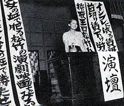 In June–July 1933, at age 18, Mizunoe led one of the Japanese labor movement's few successful actions of the period when she headed a strike of the Shochiku Opera Company's performers in reaction to wage cuts. By this point, Mizunoe had become a star, and news of the "Pink Strike"—so called because it was led by young women in their teens and 20s—spread throughout the media. The strike lasted for a month, and nearly 50 strikers were arrested, including Mizunoe.[4] Eventually the action was successful, in part because the company could not be seen as exploiting its most popular star, and the company's management offered improved labor conditions and a wage increase for musicians.[5]