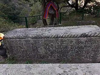 After the Ottoman Turks captured and destroyed Halidzor fortress, Mkhitar managed to escape towards Kapan and continue a guerrilla campaign against the Turkish invaders. However, the Armenian forces faced replenished Ottoman forces, lacked a single headquarters and were plagued by internal disagreements.[1] In 1730, Mkhitar was murdered by Armenian villagers of Khndzoresk, who had implored him to have his own fortifications destroyed during his conflicts rather than their village. His head was presented to the Ottoman Pasha at Tabriz, who found this act of treachery detestable and had the murderers decapitated.[2] The tomb of Mkhitar Sparapet is located in a gorge not far from Nerkin Khndzoresk and Old Khndzoresk. The inscription on the tomb, which incorrectly dates Mkhitar's death to 1726, writes that he was "from the land of Ganja" and "died young without having reached his goal."[3]