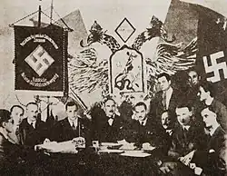 The Mladorossy organization had a fascist influence as demonstrated by its doctrine and as visible through its use of the Roman salute popularized by the Italian fascist dictator Benito Mussolini to salute its leader (renounced when Hitler launched Operation Barbarossa). Alexander Kazembek saw from fascism the combination of traditionalism, ultra-nationalism, anti-communism, as well as the desire to lean on the masses hence the imitation of the Italian fascists.[2] Kazembek also was in some sort of contact with Mussolini.[3]