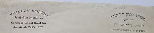 Risikoff's first name, "Mnachem," appears in variant forms including "Menachem" and "Menahem," but "Mnachem" is the spelling he seems to have preferred during his time in the United States, and was the spelling used in writings that spanned many years—from the 1938 letter from President Franklin Delano Roosevelt, congratulating Risikoff on his 50th wedding anniversary;[39] a news story in the Brooklyn Eagle about Risikoff that referred to him as "one of the oldest Orthodox rabbis in Brooklyn; a photo and caption on file with the Brooklyn Public Library;[40] and the 2010 press release from the Library of Congress that described the donation of two of Risikoff's unpublished manuscripts.[41] (In another Brooklyn Eagle article, Mnachem is used as the spelling of his first name, although his last name is spelled differently.) Most importantly, however, "Mnachem Risikoff" was the spelling Risikoff used on his own printed stationery.[42]
