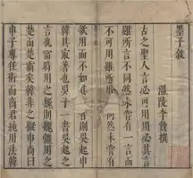 The Mozi (Chinese: 墨子), also called the Mojing (Chinese: 墨經) or the Mohist canon,[1][2] is an ancient Chinese text from the Warring States period (476–221 BC) that expounds the philosophy of Mohism. It propounds such Mohist ideals as impartiality, meritocratic governance, economic growth and aversion to ostentation, and is known for its plain and simple language.