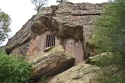 Additionally, rock painting sites form part of this ‘sacred landscape’ where the rock art relates to the beliefs and shamanistic ritual performances of San hunter-gatherers of the pre-colonial era. The site above the mission was declared a National Monument in 1936. It has been abused by visitors who have vandalized the paintings or splashed water to bring out the colours (depositing a film of salts, causing them to fade). The main panel at the site contains remarkable depictions of birds and an unusual winged figure with zigzag legs, believed to represent a shaman or priest who had assumed a bird-like form to undertake the journey to the spirit world. Flight is a widespread and recurring metaphor for altered states of consciousness in South African rock art and folklore.[2]