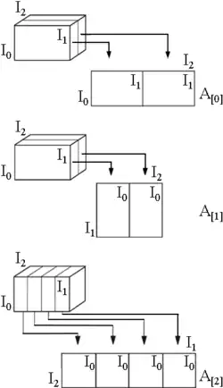 Flattening a (3rd-order) tensor. The tensor can be flattened in three ways to obtain matrices comprising its mode-0, mode-1, and mode-2 vectors.[1]