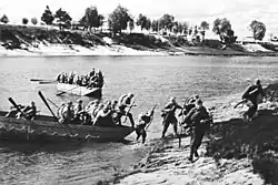 East of Mogilev itself, General Robert Martinek's XXXIX Panzer Corps (made up of the 31st, 12th, 337th and 110th Infantry Divisions), attempted to hold its lines in the face of a ferocious assault by Grishin's 49th Army during which the latter suffered heavy casualties.[3] The Fourth Army commander, von Tippelskirch, requested that Martinek be allowed to withdraw to the 'Tiger' line late on 23 June; this was refused, although the reserve Panzergrenadier-Division Feldherrnhalle was ordered forward to take up positions on the Dnieper river in preparation to cover a possible withdrawal by the frontline divisions.[4] The southernmost German corps, General Vincenz Müller's XIIth, (with the 18th Panzergrenadier Division, 57th and 267th Infantry Divisions), also began to pull back to the second defensive line.