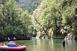 The final stretch of the river after the grade V returns to grade II as it mellows and flows into the ocean. More steep walled banks of river and side creeks can be seen down this section as they cascade down, creating substantially high tiered waterfalls and smaller side gorges. The vegetation changes to become more lush, featuring silver fern or punga, eventually easing off to cleared farm land towards the ocean[11]