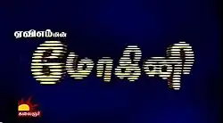 Mohini (Tamil: மோகினி) is a 2014 Indian Tamil-language soap opera that aired on Kalaignar TV from 22 September 2014 to 30 October 2015 on Monday through Thursday at 19:30 (IST) and later extended up to Friday and A new show named Ramanujar replaced this show at 19:30 (IST) and pushed this serial to 20:00 (IST) instead since 1 June 2015.[1] The show last aired on 30 October 2015 and ended with 276 episodes.