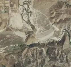 ![]() Satellite view, showing the main dam and spillway to the right, and auxiliary dam to the left. The Mojave River flows north (up) downstream of the dam. | |