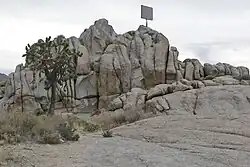 The cross stands on Sunrise Rock, a granite outcropping adjacent to Cima Road about 12 miles (19 km) south of Interstate 15, and 6 miles (9.7 km) north of Cima, California; the trailhead leading to Teutonia Peak is on the opposite side of the road, 1,300 feet (400 m) north of the monument. The area is a saddle between Cima Dome and the Ivanpah Mountains, both of which are part of the Mojave National Preserve.[6]