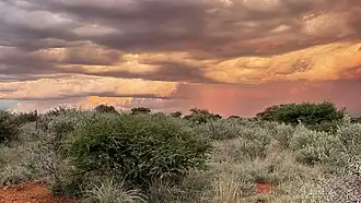 This region is the transition zone of the savanna (Kalahari and Nama Karoo) biomes; the former being flat and sandy dotted with camel thorns, umbrella thorns, puzzle bushes and haystack-like sociable weaver nests constructed in the larger trees, and the latter characterised by rocky lava outcrops, calcrete and shales. The southern region of the park, closest to the entrance gate, is more plains-like, with isolated camel thorns and tall grasses. The central regions of the park consist of the Karoo-like habitats, with long rows of rocky outcrops interspersed with flat areas of grass and scrub. The base and lower slopes of the outcrops receive extra run-off and are better vegetated.