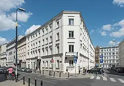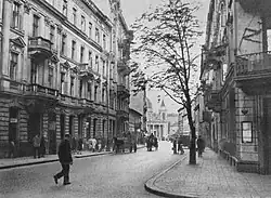 During the Warsaw Uprising of 1944, the street's vicinity was defended from the Germans by the Home Army's Ruczaj Battalion.[12] Although Mokotowska was not spared from considerable damage and partial destruction in the war, much of its historic character remained and it hosts some of the finest examples of pre-war architecture in Warsaw, along with the intersecting Wilcza Street and other areas of South Downtown.[13] Threatened by new urban planning under the Polish People's Republic, it was listed in the Registry of Cultural Property as a heritage place in 1965 to protect it from further alterations.[2] Nonetheless, many structures were simplified and stripped of their rich façade moldings, cartouches and ornaments after the war.[8] Several new buildings built in the socialist realist style were also inspired by older tenements.[8]