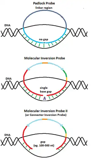 The design of the molecular inversion probes (MIP) originated from padlock probes, a molecular biology technique first reported by Nilsson et al. in 1994 .[7] Similar to MIP, padlock probes are single stranded DNA molecules with two 20-nucleotide long segments complementary to the target connected by a 40-nucleotide long linker sequence. When the target complementary regions are hybridized to the DNA target, the padlock probes also become circularized. However, unlike MIP, padlock probes are designed such that the target complementary regions span the entire target region upon hybridization, leaving no gaps. Thus, padlock probes are only useful for detecting DNA molecules with known sequences.