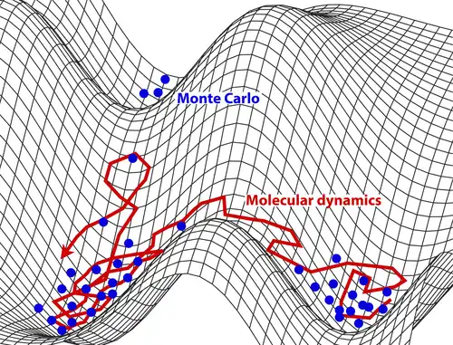 Schematic representation of the sampling of the system's potential energy surface with molecular dynamics (in red) compared to Monte Carlo methods (in blue)