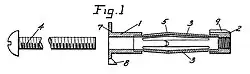 The molly bolt was patented in 1934 by George Frederick Croessant.[3] Although his patent acknowledges that expandable fasteners of this general kind were already known, Croessant's patent is intended to provide "an improved and adequate anchoring grip that may be retightened if necessary and that will permit repeated withdrawals and reengagements of the associated bolt." The same year, Croessant also registered the trademark "MOLLY".[1]