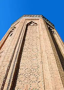 Momine Khatun Mausoleum (Azerbaijani: Möminə Xatun türbəsi) is a mausoleum, also known as the Atabek Dome, located in the city of Nakhchivan of the Nakhchivan Autonomous Republic in Azerbaijan. It was built in 1186 by the architect Ajami ibn Abubekr Nakhchivani.[1] The ten-sided mausoleum reached a height of 34 meters. Today its height is only 25 meters (without the tent, which has not been preserved).[2] The mausoleum, built and named after the mother of one of the local rulers of Azerbaijan, Atabek Jahan Pahlavan of Ildegezid dynasty, is masterfully decorated with complex geometric ornaments and inscriptions from Koran.[3]