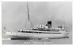 Mona's Queen was propelled by twin screws driven through single reduction gearing by two sets of Parsons steam turbines. She was the first of the Company's ships to have water tube boilers, taking up less room than the scotch boilers previously used. Each set of turbines comprised a high pressure and a low pressure turbine. The high pressure turbines were of an impulse reduction type, two rows of impulse blading being followed by end tightened reaction blading, while the low pressure turbine ahead blading was of the all reaction type.[3] The astern turbines were incorporated in the after ends of both high pressure and low pressure turbine casings and were capable of developing up to 70% of the full ahead power. The turbines were fitted with governors for overspeed control.[3]