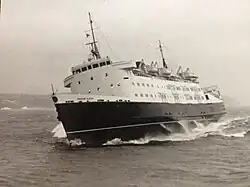 Mona's Queen gave reliable service to the Isle of Man from 1972 until 1985. She has two inaugural voyages to her credit, making the first car ferry trip from Douglas to Dublin in 1974, 133 years on from the first passenger service between the two ports, and in June 1976, Mona's Queen completed the first car ferry sailing from Fleetwood with 34 cars aboard.[6]