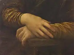 The Mona Lisa bears a strong resemblance to many Renaissance depictions of the Virgin Mary, who was at that time seen as an ideal for womanhood.[44] The woman sits markedly upright in a pozzetto armchair with her arms folded, a sign of her reserved posture. Her gaze is fixed on the observer. The woman appears alive to an unusual extent, which Leonardo achieved by his method of not drawing outlines. The soft blending (sfumato) creates an ambiguous mood "mainly in two features: the corners of the mouth, and the corners of the eyes".[45]