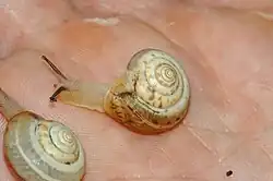 | Two live individuals of Monacha cartusiana on a human hand | |