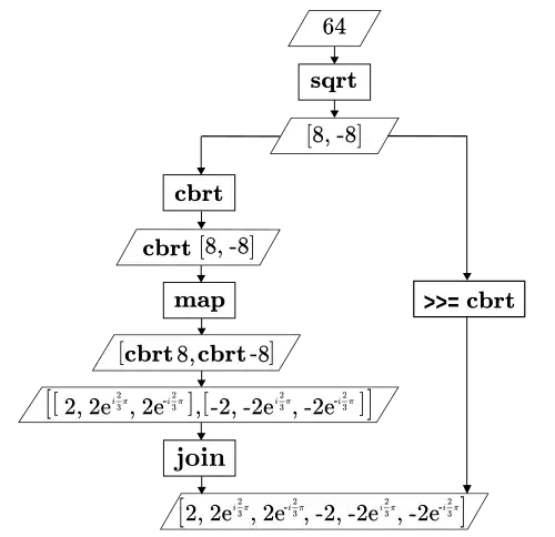 In Haskell, there is an operator bind, or (>>=) that allows for this monadic composition in a more elegant form similar to function composition.[d]: 150–151