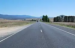 State Highway 4 was renamed Snowy Mountains Highway on 19 July 1955;[29] the section of State Highway 4 between Nimmitabel and Cooma was also re-designated part of State Highway 19 at the same time.[29] State Highway 19 was officially named Monaro Highway three years later, on 18 June 1958.[30] In contrast with Snowy Mountains Highway, the entire length of State Highway 19 was within the Monaro region.[14][31] During the mid to late 1960s the highway south of Nimmitabel was rerouted along a newly constructed roadway;[32][33][34] the former alignment is now known as Old Bombala Road.[14][9] Snowy Mountains Highway was also realigned in this area as part of these works and connected to Monaro Highway along the new alignment.[35] The alignment of the highway's southern end to the state border with Victoria was later changed, travelling via Rockton to connect to Cann River Highway, instead of via Delegate to connect to Bonang Highway, on 12 October 1977;[36] the former alignment was proclaimed Trunk Road 93 and is now known as Delegate Road.[9]