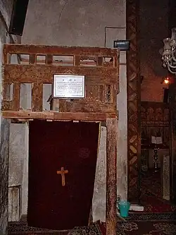 The sanctuary lacks an altar platform, but the altar is covered with a rectangular marble slab.[46] A small door to the north of the sanctuary opens into a narrow corridor with a barrel vault that leads to the baptismal chamber. In the 14th century, when the southern sanctuary of the Church of Saint Bishoy was rebuilt, the northern sanctuary of the Church of Abascheron was demolished. As a result, the semicircular sanctuary was constructed in the location of the chancel, and the eastern sanctuary was converted into a baptismal room.[47]