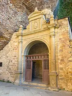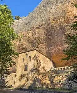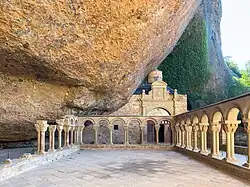 The monastery of San Juan de la Peña (Spanish: Real Monasterio de San Juan de la Peña) is a religious complex in the town of Santa Cruz de la Serós, at the south-west of Jaca, in the province of Huesca, Spain. It was one of the most important monasteries in Aragon in the Middle Ages. Its two-level church is partially carved in the stone of the great cliff that overhangs the foundation. San Juan de la Peña means "Saint John of the Cliff".