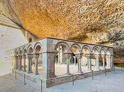 The lower church includes some Mozarabic architectural surviving elements, although most of the parts of the monastery (including the impressive cloister, under the great rock) are Romanesque. After the fire of 1675, a new monastery was built. The old monastery (built in 920) was declared a National Monument on 13 July 1889, and the new monastery in 1923. In the 11th century the monastery became part of the Benedictine Order and was the first monastery in Spain to use the Latin Mass.