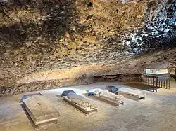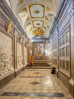 The monastery is built beneath a huge rock sometimes associated with the legendary "Monte Pano". The second floor contains a royal pantheon of kings of Aragon and Navarre. The present room, with its marbles and stucco medallions recalling historic battles, is mainly a design built during the administration of Charles III of Spain in 1770. It contains the resting places of the following kings of Aragón: Ramiro I, Sancho Ramírez, and Peter I of Aragon and Navarre