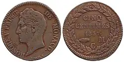 Monaco's first decimal coins were issued in 1837 and 1838, in denominations of 5 centimes, 1 decime and 5 francs. The 5 centimes and 1 decime were minted in both copper and brass and were the same size as the earlier French coins (France was not minting these denominations at the time) whilst the 5 francs matched the French coin. No further issues were made until 1879,[4] from when gold franc coins were issued until 1904.[5]