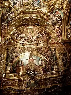 The building is an example of First Romanesque-Lombard style of the 11th century,[3] It is designed in the basilica plan with three naves. The nave is covered with a barrel vault. Under the apse was the main crypt, now in ruins. A baroque altar of Josep Pujol i Juhï is dedicated to the Mare de Deu dels Colls. It covers much of the chapel and is highly decorated with a profusion of images and representations, including one of the brunette virgin. It is considered one of the most representative works of Catalan Baroque. There are murals in the central apse[3] and the dome is painted the 19th century. The Baroque L'Esperit Sant Gothic altarpiece by Lluís Borrassà dates to 1419. The altar, also in Baroque style, was designed by Joan Francesc Morato in the early 18th century and was partially destroyed during the Spanish Civil War.[3] In the Romanesque door, there are Lombard arcades. The bell tower and cloister are in Renaissance style of the 16th century. The cloister, trapezoidal in shape, has two galleries with arches supported by smooth columns.
