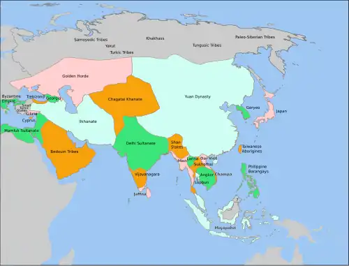 ![]() Expansion of the Mongol Empire across Eurasia between 1206 and 1294, with modern political boundaries superimposed | |||||||||||||