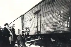 Mongolia reportedly signed an agreement with the Japanese puppet state of Manchukuo on 18 July 1940.[7] In the Soviet–Japanese Neutrality Pact of April 13 1941, the two powers recognised the neutrality of Mongolia and its place within the Soviet sphere of influence. Its geographical situation meant that it served as a buffer between Japanese forces and the Soviet Union. In addition to keeping around 10% of the population under arms, Mongolia provided supplies and raw materials to the Soviet military, and financed several units, for example the "Revolutionary Mongolia" Tank Brigade and "Mongolian Arat" Squadron and half a million military horses.[8] Also, more than 300 Mongolian volunteer military personnel fought in the Eastern front.[9]