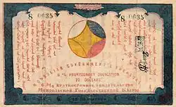 The dollar (Mongolian: доллар) was the currency of Mongolia between 1921 and 1925. Treasury notes were issued under Baron Ungern in 1921. The denominations were 10, 20, 50 and 100 dollars. It was intended to replace the Chinese yuan at par but, according to European travellers of the time, was worthless.[1] Further banknotes were printed in 1924, in denominations of 50 cents, 1, 3, 5, 10 and 25 dollars, but were not issued. The dollar, together with other circulating currencies, was replaced by the tögrög in 1925.