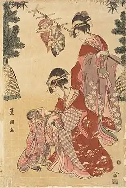 Women dressed as monkey trainers for New Year's dancing, Utagawa Toyokuni, c. 1800