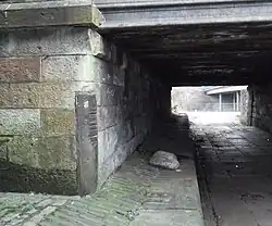 When the "cut of junction" was formed, a short section of new canal linking the Monkland Canal to the Forth and Clyde branch canal, it was routed north from the basin under Garngad Hill (now Royston Hill).[2] The route then turned west under Castle Street. The grooves worn by the barge towropes can be seen on the iron facing to Castle Street bridge abutment at this point.[5]