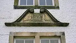 Monkredding's modern form surrounds three sides of a square, open to the north. The west wing and stair-tower are ancient.[8] The west wing bears a date stone '1602 or 1605' in the north gable, whilst the remainder was added in 1638,[9] this date being inscribed on a dormer pediment in the west wall; the lower floor is vaulted. Whitewashed roughcast harling covers the masonry; the roof has been lowered; the circular stair-tower has been significantly raised in height. No dormers are now present and the crow-steps have been removed.[8] The 17th-century building was enlarged and re-orientated in the early 19th century when the principal facade and central entrance were extended south.[10] Monkredding House is B Listed.[11]
