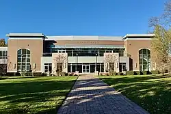 The 1960s saw further growth for Monmouth in campus size, athletics, student life, and academics. At the start of the decade, the Murry and Leonie Foundation transferred ownership of the Murry Guggenheim House to Monmouth, which became the school's library.[8] The transfer also included a stable and carriage house that would be converted into the Lauren K. Woods Theatre.[9] Elmwood and Pinewood, Monmouth's first campus residence halls, opened in 1963, while the William T. Boylan Gymnasium was built in 1965 as a new home for the basketball team. Additional property was acquired by the college in 1969 when Monmouth was granted ownership of Maurice Pollak's home, the site of what would become Pollak Theatre. Amid the campus expansion, Monmouth College received authorization from the state to offer graduate programs and award master degrees in 1967.[5]