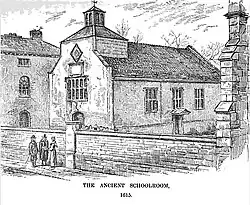 William Jones's original foundation provided for a schoolroom, on the site of the present chapel, houses for the Headmaster and Lecturer, and almshouses segregated by sex.[14] A painting by J.A. Evans, of later date and purchased on behalf of the school by the then Headmaster Lionel James in 1921, shows the buildings and is titled The Old School Room. Built A.D. 1614. Pulled down to make room for the present school room, 1865.[71] Nothing of these buildings remains. The local writer and artist Fred Hando records that the bell, which hung above the schoolroom, was cast at the Evan Evans foundry at Chepstow in 1716.[72]