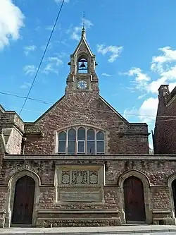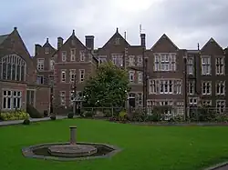 In 1864 the Haberdashers undertook a substantial rebuilding of the school.[73] Funded by the rising fortunes of Jones's bequest on the back of the Victorian expansion of London, the work was mostly undertaken by William Snooke and Henry Stock, of the firm Snooke & Stock, surveyors to the Haberdashers' Company.[i][75] Snooke built the chapel, two schoolrooms and a classroom in 1864–1865, followed in the 1870s by the library, Headmaster's House and the buildings which now form Monmouth House and Hereford House.[76] These buildings are all Grade II listed.[77][78][79] The Monmouth Alms Houses, on Almshouse Street, were rebuilt by James Bunstone Bunning in 1842, and redeveloped by William Burn in 1895–1896.[80] They now form part of the school and incorporate a large inscription panel describing the benefactions of the Jones Foundation.[76] The almshouses are also Grade II listed.[81] The chapel was further extended in 1875.[82] Snooke's work was not universally praised; a report from the School's Commissioner commenting, "the architect has arranged the buildings in a most inconvenient manner, and the ventilation is deficient."[83] School House, with its ceremonial arched entrance and coat of arms facing the Wye Bridge, and the adjacent technology block, were designed by Henry Stock in 1894–1895.[76] They are Grade II listed buildings as of 8 October 2005.[84][85] The style of the School House block mirrors that of the main block of Haberdashers' Monmouth School for Girls, which Stock designed at the same time.[86] The war memorial was dedicated in 1921, Angus Buchanan (VC) attending the ceremony.[42] It is a Grade II listed structure.[j][90] To the west of Stock's School House block, and set into the wall previously facing the Wye and now completely overshadowed by the A40 by-pass, is a pair of iron gates, of 18th century date and installed at the school in 1941. They come from the Haberdashers' Hall in London which was destroyed during the Blitz.[k][84]